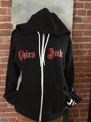 It's chiropractic caduceus tat style! Banners proudly display health and chiropractic on the back, CHIROPRACTIC down the left sleeve and the ChiroInk logo on the front. This is an incredibly soft and relaxed unisex hoodie, spun from a plush poly-cotton blend, will quickly become a go-to essential. Features a relaxed fit, hood with white drawstrings, full zip closure and ribbed cuffs and waistband.