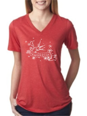 Sure to become your favorite tee! Who doesn't love birds? Super soft poly-cotton-rayon blend in a relaxed fit. It is super flattering with a modern feminine shape and flowing fabric that fits well on all body types. ¾ length sleeve.
